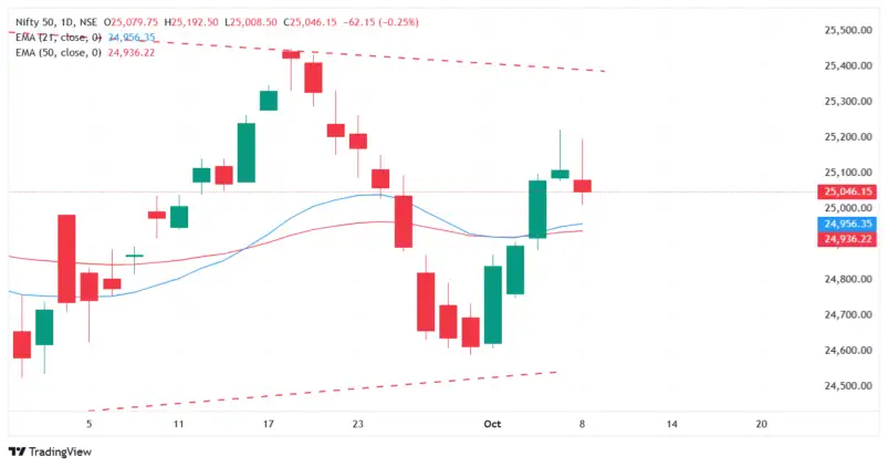 On the technical front, the index closed below Tuesday's close before hitting 25,200 levels, forming another shooting star pattern. This indicates a strong selling pressure and resistance at the 25,200 levels for NIFTY. The immediate downside support for the index stands at the 21 EMA levels of 24,950.